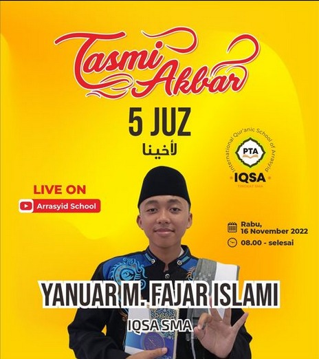 Live Tasmi’ 5 Juz Sekali duduk oleh ananda Yanuar Muhammad Fajar Islami, Santriwan IQSA SMA asal Gresik, di channel YouTube Arrasyid School.